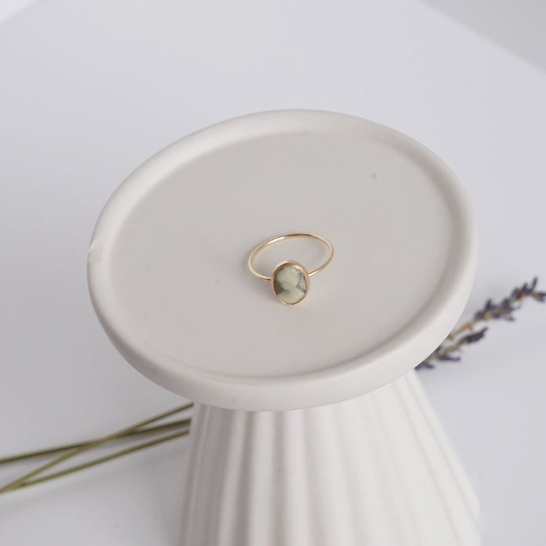 This ring is made in 14/20 Gold-Filled, the stone is oval in olive green and white with a measurement of 10x8mm. This ring is made in our Manusilu Jewelry workshop which is established in the city of Draper UT, each piece comes in its case to prevent it from being damaged and keep it safe until it reaches your hands.