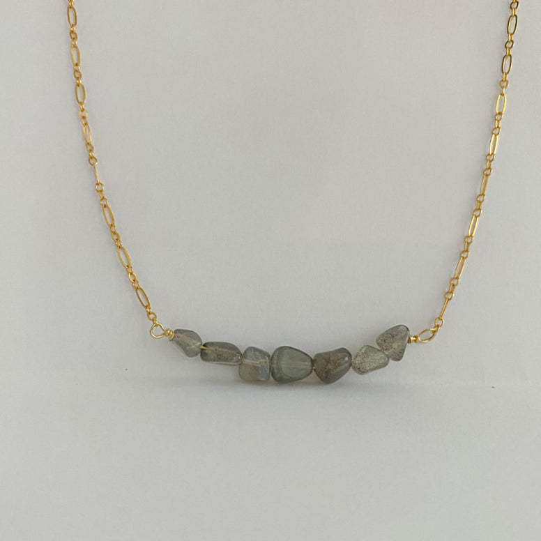 Made in 14k gold filled, in the middle it has a bar of labradorite nuggets, this garment is very comfortable and super light, take it wherever you go. This necklace is made in our manusilu jewelry workshop that is established in the city of Draper UT, each piece comes in its case to prevent damage and keep it safe until it reaches your hands.